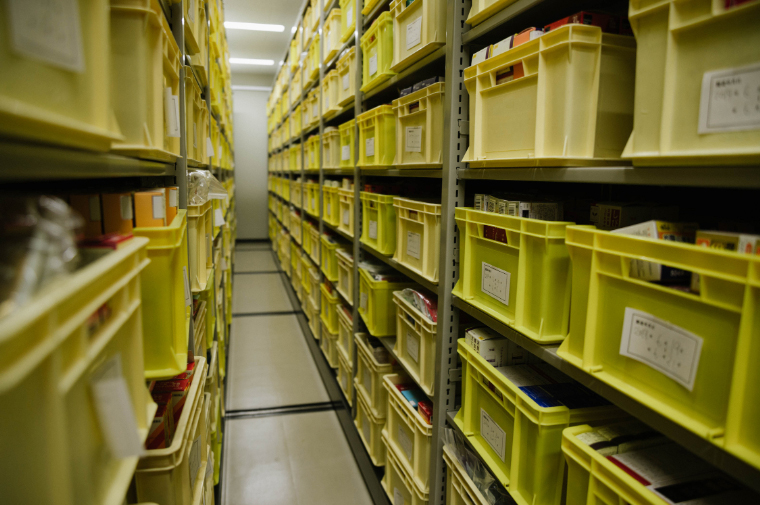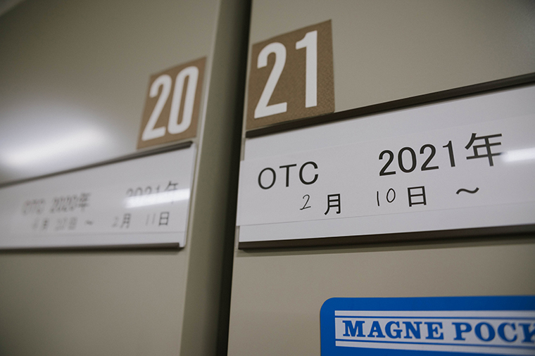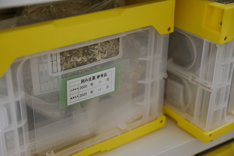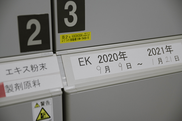 ご利用頂いている漢方薬についてお問い合わせがあった際に備えて、使用期限以上に製品サンプルを工場内で保存しています。患者様の保管環境を想定した状態で保存しており、製造番号をお伝えいただければ、その製品と同じタイミングで製造された原料サンプルから最終製品サンプルまでを確認し問題がなかったかを確認することができるようになっています。お届けした製品がしっかり使われるまで責任を持って確認する。医薬品メーカーとしての努めです。