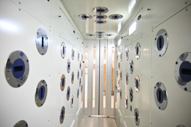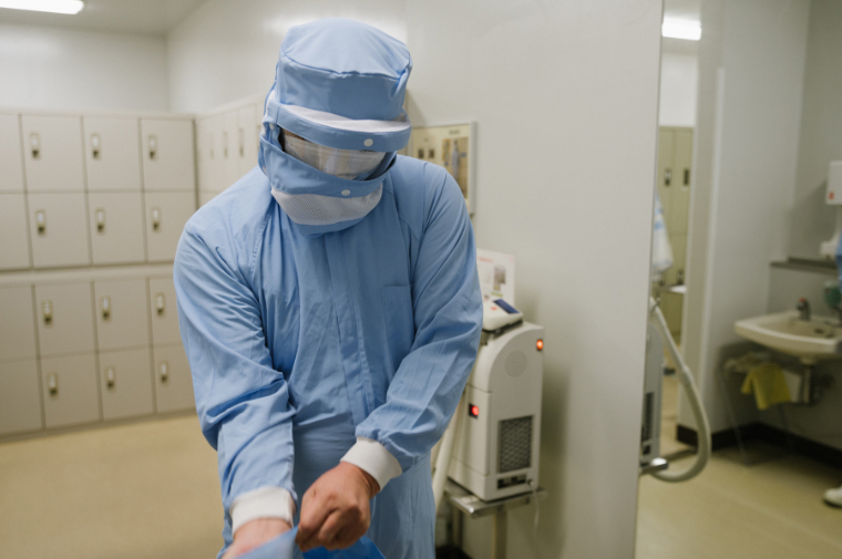 高岡工場の最終製剤工程。四段階のエリア区分を設定し衛生状態をコントロールしています。特に秤量から製剤までの工程はゾーンⅠと指定され、無塵服とゴーグルに着替えて入室という最高レベルの衛生基準で管理されています。人や資材を移動する際も、片方のドアを閉めないともう片方のドアが開かないインターロックシステム、入室時のエアシャワー、手洗いの徹底など、エリアをまたいで、ほこり等が持ち込まれないように運用をしています。クラシエは医薬品製造会社として、医薬品GMP(医薬品の製造管理および品質管理に関する基準)の三原則のひとつ「汚染防止」に正面から取り組んでいます。