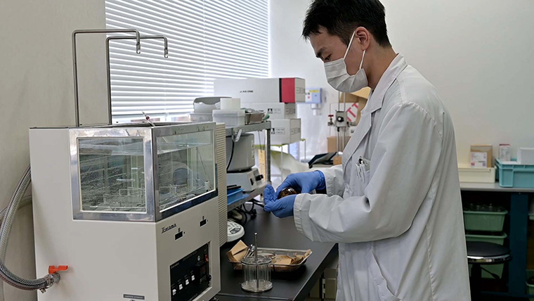 化学的に成分を合成する西洋薬と異なり、自然由来の成分を抽出する漢方薬の錠剤開発は溶けにくさとの戦いでもあり、早く溶けさせるために体内で素早く崩壊することが重要となります。そのため体温に近い37℃のお湯で規定された時間以内に胃の中で元の形がなくなるまで崩壊するか製品ごとに確認しています。添加剤を多くすることでより溶けやすくすることも可能ですが、そうしてしまうと錠剤が大きくなり飲みにくくなってしまいます。溶けやすさと飲みやすさを両立し、可能な限り小さく溶けやすい錠剤を開発するために分量を細かく調整し、トライ&エラーを繰り返す。漢方薬の錠剤の小さな変化ですが、積み重ねていくことで、患者様のためになる。そんな想いで日々改良を繰り返しています。