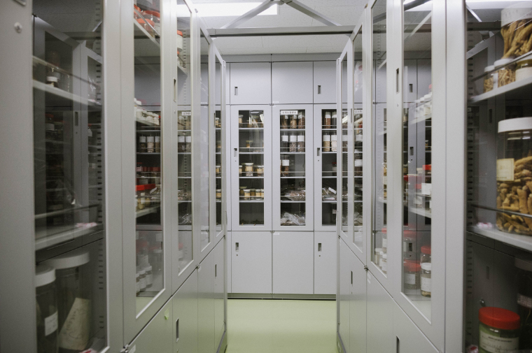 漢方研究所内にある生薬保管庫。ここには90年以上前の生薬を含む今では手に入らない貴重な生薬のサンプルが多数保管されています。時代や場所によって同じ生薬でもその植生や成分はさまざま。さまざまな時代や場所の生薬を保管しておき、その成分量などを今の生薬と比較することで、研究に役立てています。生薬保管庫はいつも15℃以下に設定されており、ひんやりとして静かな部屋ですが、クラシエが漢方薬製造に取り組んできた長い歴史を感じさせる場所です。