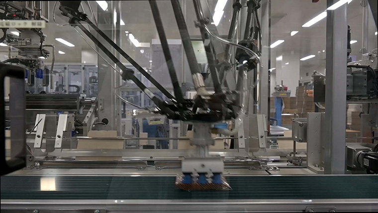 医療用漢方薬の自動包装のため、2020年にロボットアームが稼働する包装機を導入しました。高岡工場の包装エリアには、この多くの包装機が横並びに整然と配置されています。一部人間の手を借りる半自動だった工程の完全自動化を実現しました。箱を折る、製品を入れる、閉じるという3つの工程をロボットアームを含む機械を使用し自動化することで、密閉性がさらに向上。箱の隙間からの虫等の混入を防げるようになり、さらなる安全をお届けできるようになりました。