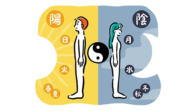 例えば、季節で考えると、春から夏にかけては「陽」に向かっていきますが、夏から冬にかけては「陰」に向かっていきます。人も「陰陽」に分けることができます。お腹は「陰」で背中は「陽」です。お腹は影になるため「陰」に、背中は太陽の光があたるため「陽」になります。このように、「陰と陽」がうまくバランスを保って共存することによって健康を維持しています。