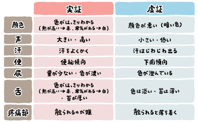 それでは自分がどちらの状態なのかを確認してみましょう。 虚証・実証はどちらも正常な状態ではありません。 虚証・実証がわかることは、現在の体調不良は何が原因で起こったのかを見定める手段となります。 ・虚実のチェックシート 次の虚実のチェックシートで何が原因かを確認しましょう。 「実証」は体の外から邪気が侵入した状態です。実証は、気血水のタイプでは気滞・瘀血・水滞などに分けることができます。 「虚証」は、体の機能が減少している状態です。虚証は、気血水のタイプでは血虚・陰虚・気虚などに分けることができます。