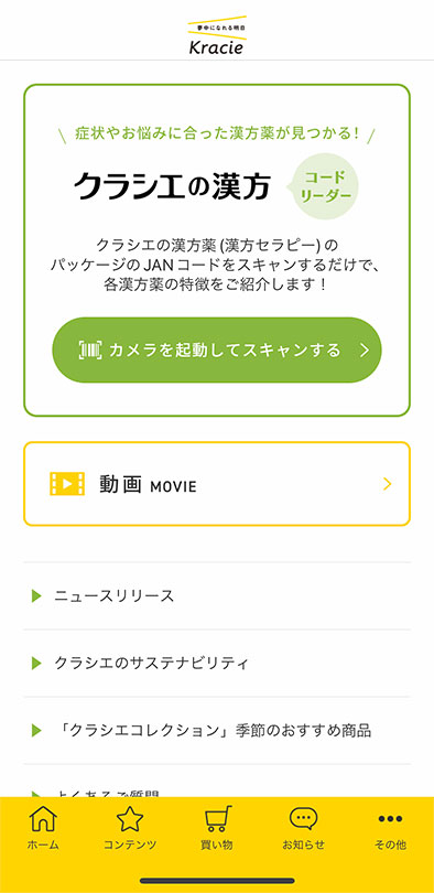 クラシエの漢方薬(漢方セラピー)のバーコードをスキャンすることで、各漢方薬の特徴を動画でご紹介する機能「クラシエの漢方 バーコードリーダー」や、位置情報や地名、駅名を検索すると近隣の漢方セラピー取り扱い店舗を調べることができる「取り扱い店舗検索」など便利な機能が満載。
