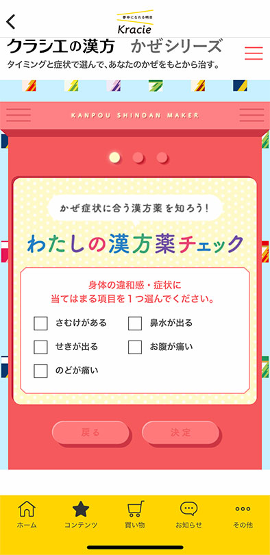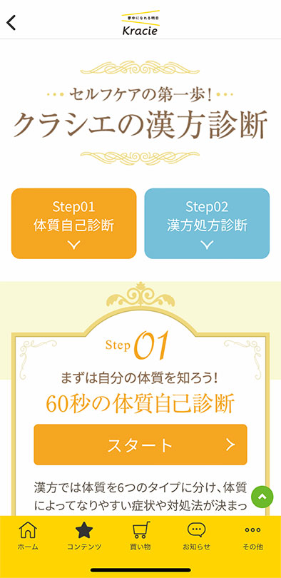 体質自己診断と症状別の漢方処方診断ができるコンテンツです。7つの質問に回答すると、体質を診断し、体質別のなりやすい症状や改善のアドバイスを提供します。