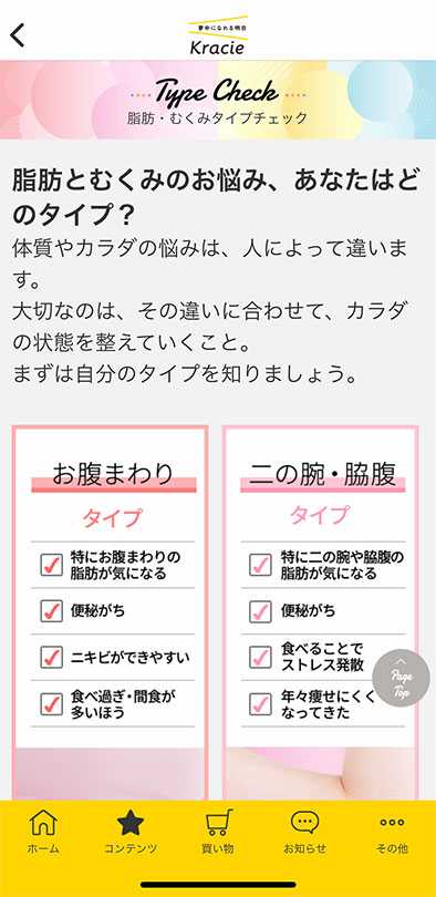 自分の太り方や体質を知ることのできるコンテンツです。12個の質問に回答すると、お腹まわり、二の腕・脇腹、下半身むくみ、顔や手足のむくみ・冷えの4つのタイプを診断し、症状に合ったアドバイスを提供します。
