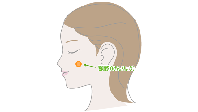 あごのラインよりも少し頬側にあり、歯をぐっと食いしばると筋肉が盛り上がり、口を開くとへこむ場所です。「頬車」はたるみや二重あご、吹き出物などの悩みに効果的なツボ。むくみケアや小顔効果も期待できます。