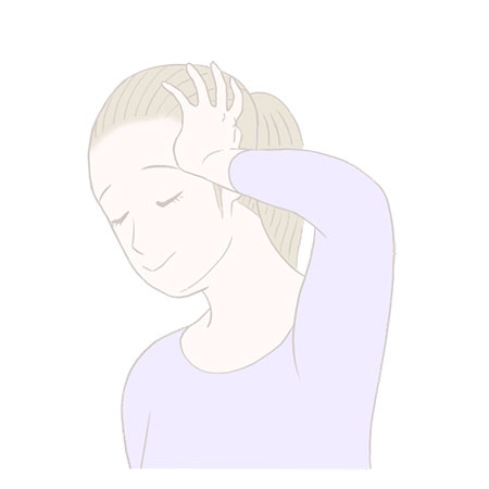 - ② こめかみのあたりを手のひら全体で側頭筋を包み込み、手のひらの下半分を使って筋膜を斜め上にゆっくり引き上げます。少しずつ位置をずらして丁寧にほぐします。