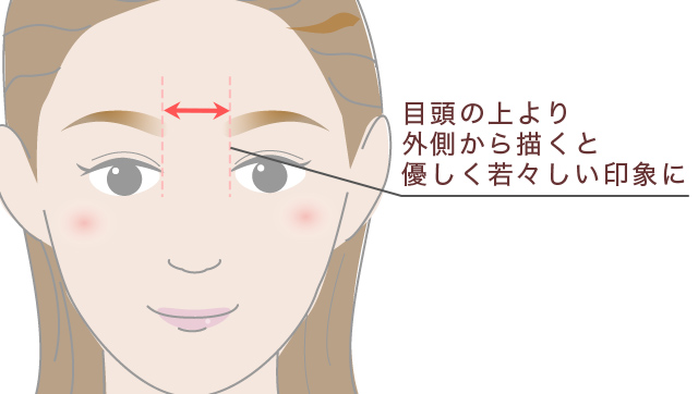 眉頭を目頭よりも内側に濃く描いてしまうと、力強く男性的な印象になりがち。優しく女性らしい印象に仕上げるには、眉頭を淡く少し外側気味に描くようにしましょう。程よいナチュラル感を出すには、眉間の広さも押さえておくべきポイントです。