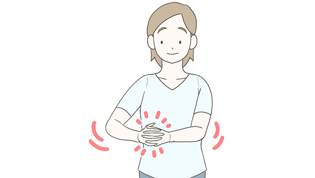 - ① 両手の指を組み合わせ、右の肋骨下部あたりに密着させる