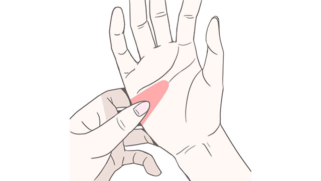 肝臓の反射区は、右手のひらの小指と薬指から下に下りた三角地帯にあります。左手の親指の腹で押したり刺激を加えたりします。呼吸を止めずに痛気持ちいい部分を見つけて丁寧に刺激しましょう。