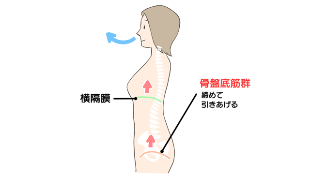 ①息を吐く時におしっこを我慢するときのように骨盤底筋群(尿道・膣・肛門周辺の筋肉)をカラダの中心に集めるように力を入れます。