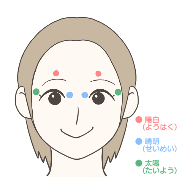ツボの場所:眉尻と目尻の中央からやや後ろ(こめかみ寄り)の窪んだ所