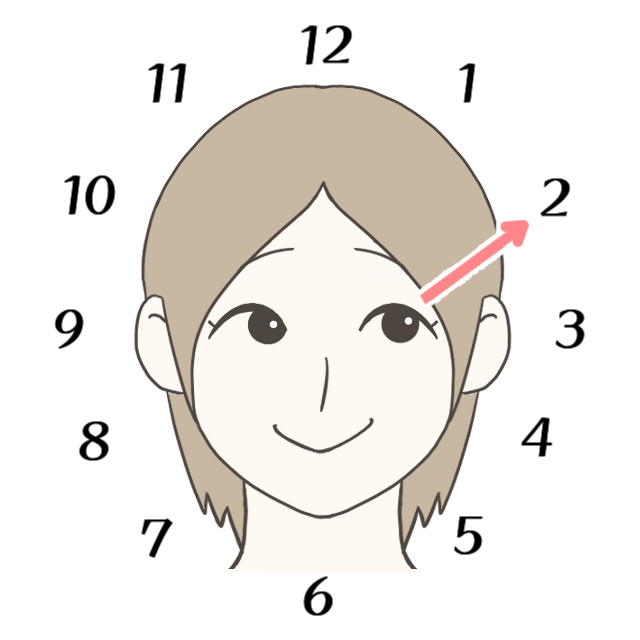 (2)自分の顔を時計の文字盤に見立てて目線を針のようにイメージし、眼球を時計回りに1時から順番に動かし1周させます。
