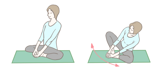 「あぐら」の姿勢に似ていることから簡単そうに見えますが、骨盤が後ろに倒れて背中が丸まってしまう、ひざの高さに左右差ができてしまうことがあります。無理のない範囲で行いましょう。前屈の動作が難しい場合は、ブランケットやタオルをお尻の下に敷いて骨盤が前に倒れやすいよう工夫をしてみて下さい。