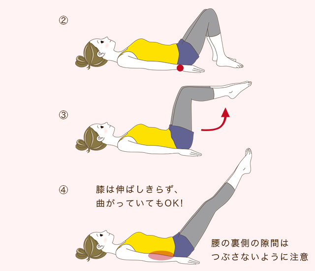 ※腰が反らないように肋骨と腰骨でしっかりマットを押しましょう。腰に痛みがある場合はやめましょう。