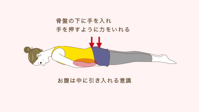 ② 腰骨の2点と恥骨を結ぶ三角形が床と平行になるように骨盤の傾きを確認しましょう。その時に腰の裏側に少し隙間があいているのを認識します。(骨盤の厚みや肉付きによって個人差があります)