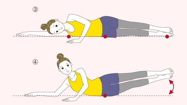 ④ 息を吐きながら、下になっているウエストのくびれをマットに押し込むようにし、上半身とそろえた脚を床から持ち上げます。そして息を吸いながら元の位置に戻しましょう。