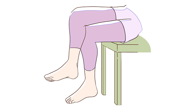 ① 椅子に座り脚を組みます。その際に下の脚の膝頭の真上に上の脚の膝裏がぴったり重なるようにします(ツボ:委中)。