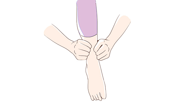 ② 軽く握った両手を猫の手のようにしてスネの骨をはさむように密着。足首から膝まで下から上に向って軽く圧迫しながらこすり上げていきます。(ツボ:三陰交・足三里)