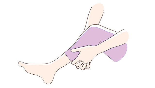 ① 体育座りの要領でお尻を床につけて座り、片脚ののふくらはぎの下で両手の指を軽く組み合わせます。