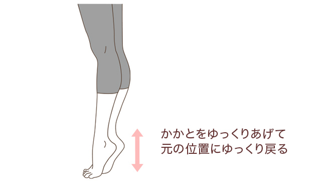 ② つま先にしっかりと体重が乗るように意識しながらゆっくりかかとを持ち上げます。