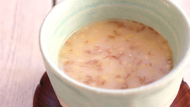 ②鍋などで温めた甘酒に①を加えて混ぜてから器に注ぎ入れる。