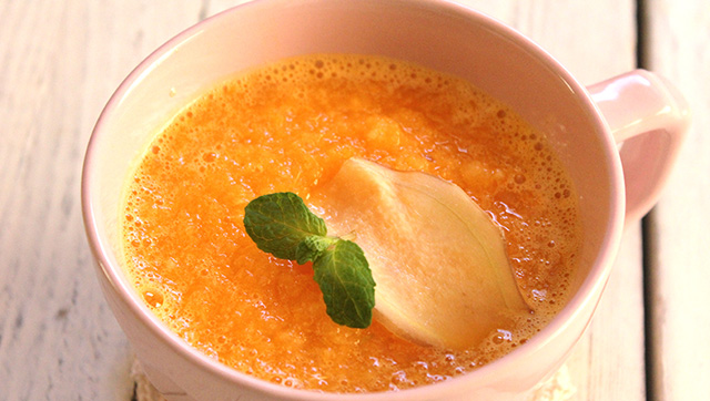 氷を入れたいところですが・・・常温でいただきましょう!温めてフルーツポタージュのようにいただくのもオススメです!お好みでココナッツミルクを加えてもOK!