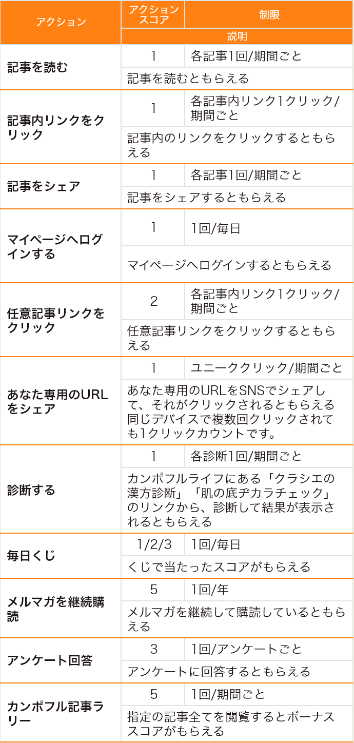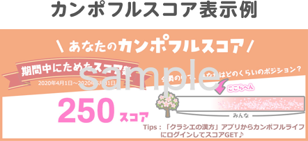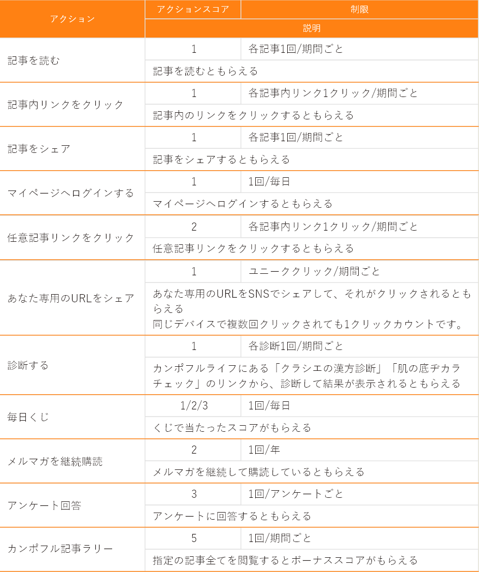 たまるカンポフルスコアのアクションスコア数は、そのアクションに応じて異なります。また、期間ごとにアクションにより、たまるアクションスコアは変更する場合があります。