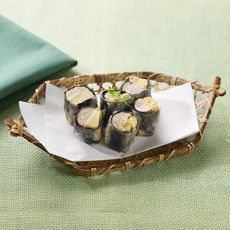 揚げる具材全体に衣をつけ、160℃に熱した油で5分ほど揚げる。揚げあがりは強火にし、カラりと揚げる。油を切って、一口大に切る。