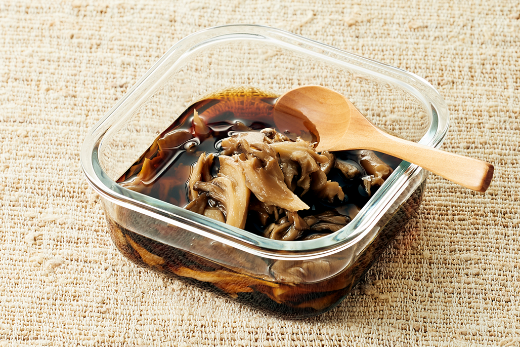 舞茸めんつゆを多めに作り置きするのもおすすめ。冷蔵庫で1週間保存可。他の麺類、煮物、スープなどにも利用でき、おいしい時短料理になります。