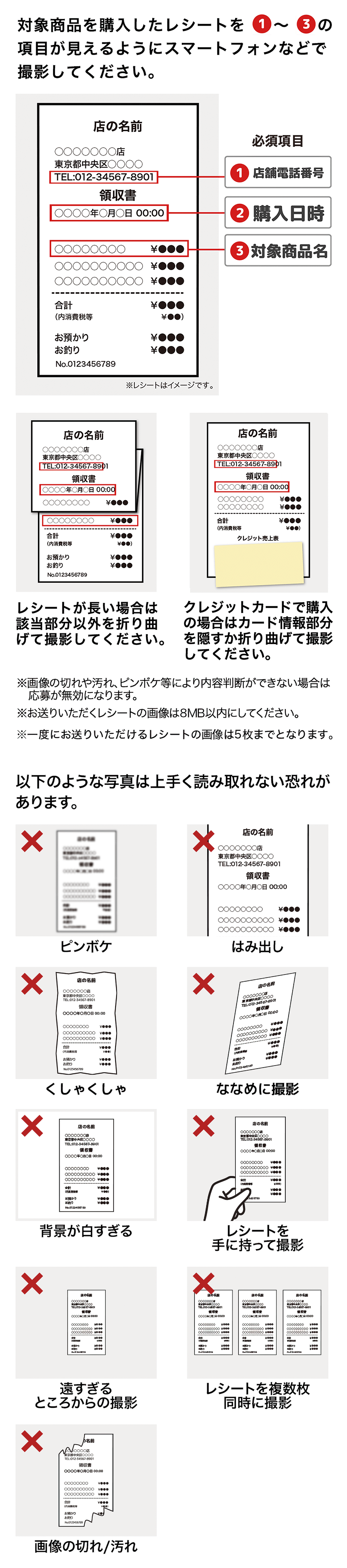・レシート画像は、購入店舗、購入店舗の電話番号、購入日時、購入商品名、売価および合計金額などが判読できるようにご撮影ください。