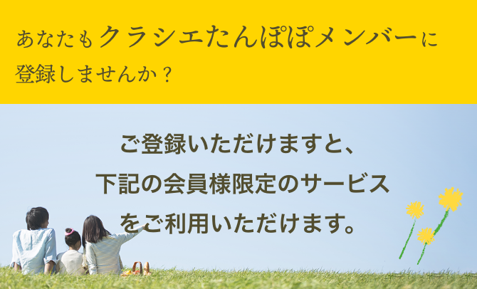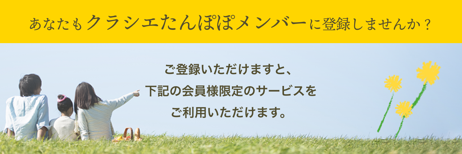 クラシエたんぽぽメンバーは、日ごろクラシエをご利用いただいているお客様、もしくはクラシエ商品に興味を持っていただいている方への感謝のために開設した会員サービスです。クラシエたんぽぽメンバーにご登録いただくと、暮らしに役立つ情報がいっぱいのメールマガジンが届いたり、クラシエが実施するキャンペーンやアンケート応募の面倒なフォーム入力が簡単になります!