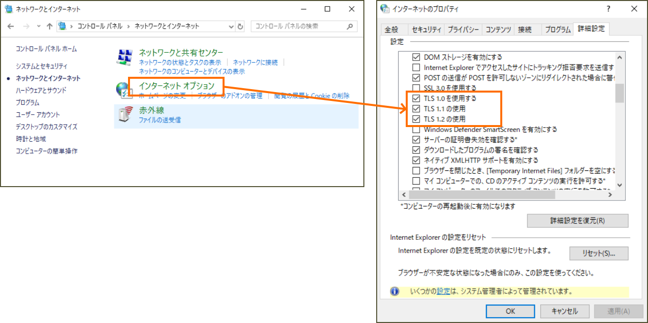 [スタート]→[Windowsシステムツール]→[コントロールパネル]→[ネットワークとインターネット]→[インターネットオプション]→[詳細設定]