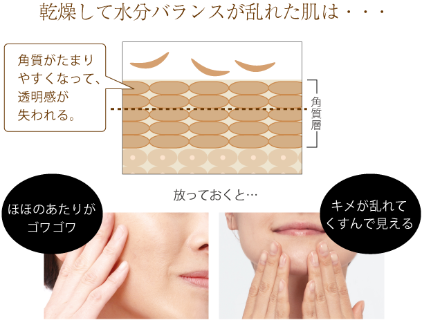 乾燥して肌の水分バランスが乱れてしまうと、乾燥によるくすみで、肌が暗く、老けて見えてしまいます。