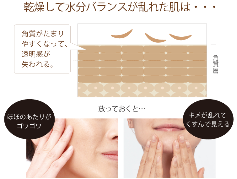 乾燥して荒れた肌は、キメが乱れて透明感を失ってしまいます。