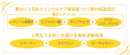 美しさを邪魔する乾燥小じわを対策!乾燥を放っておくと目もとや口もとなどのあちらこちらに小さなしわが・・・。これこそが大人の美しさを悩ます乾燥小じわ。メイクで隠してもいつの間にか現れて、年齢印象を上げてしまうこの乾燥小じわに、リンクルケア美容液(集合レチノール)がしっかりとアプローチ。さらにローヤルゼリー配合の高保湿美容液が上質なうるおいで大人の肌を贅沢に包み込みます。Wの美容液で豊かなうるおいが続き、ハリ・弾力のある肌へ整えて、乾燥による小じわを目立たなくします。