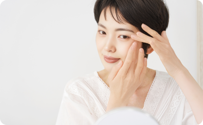 乾燥による小じわが出やすい目もと・口もとを集中ケアするには、顔全体につけた後、片方の手で引き上げながら、ていねいに指先でたたきこむように重ねてつけましょう。