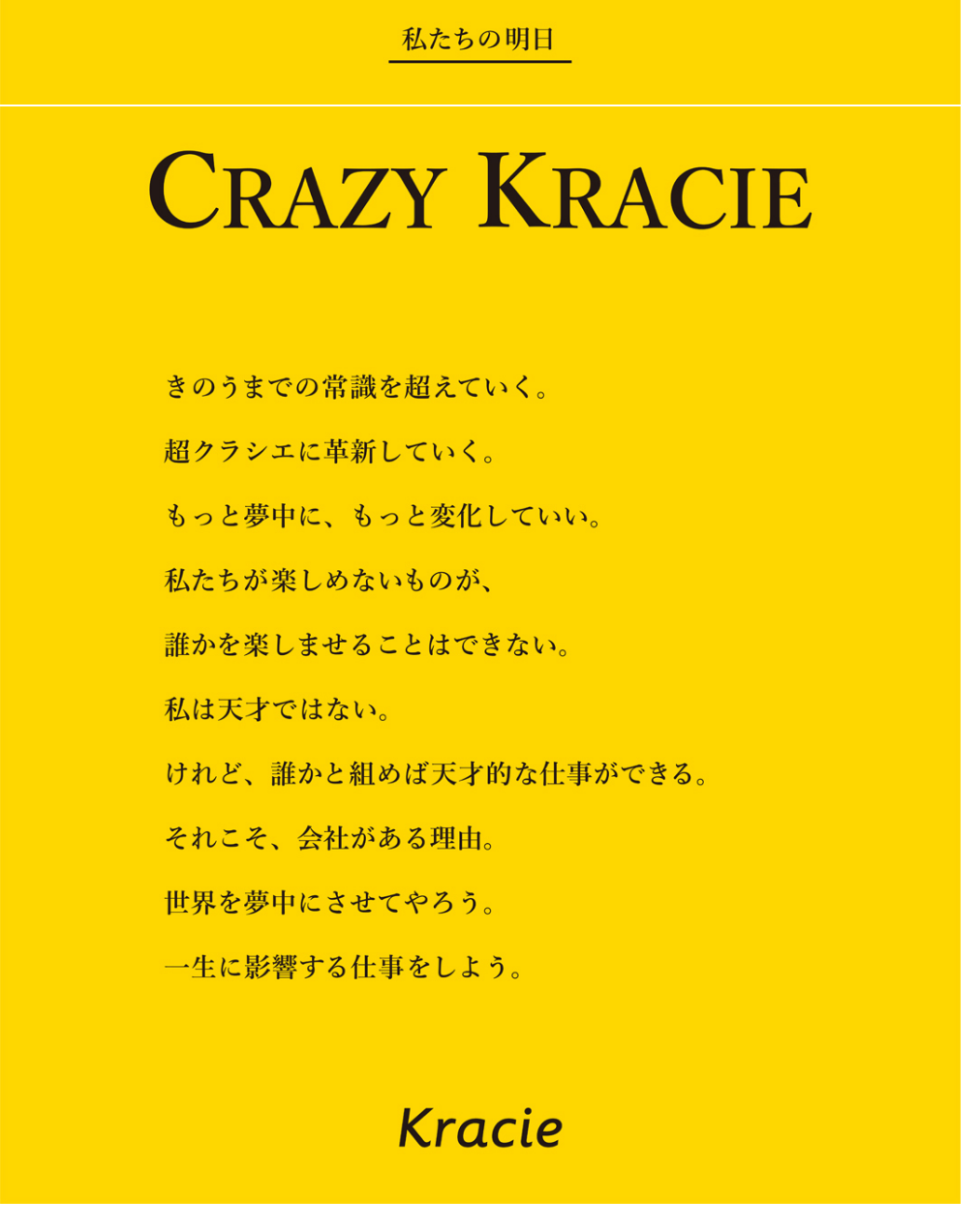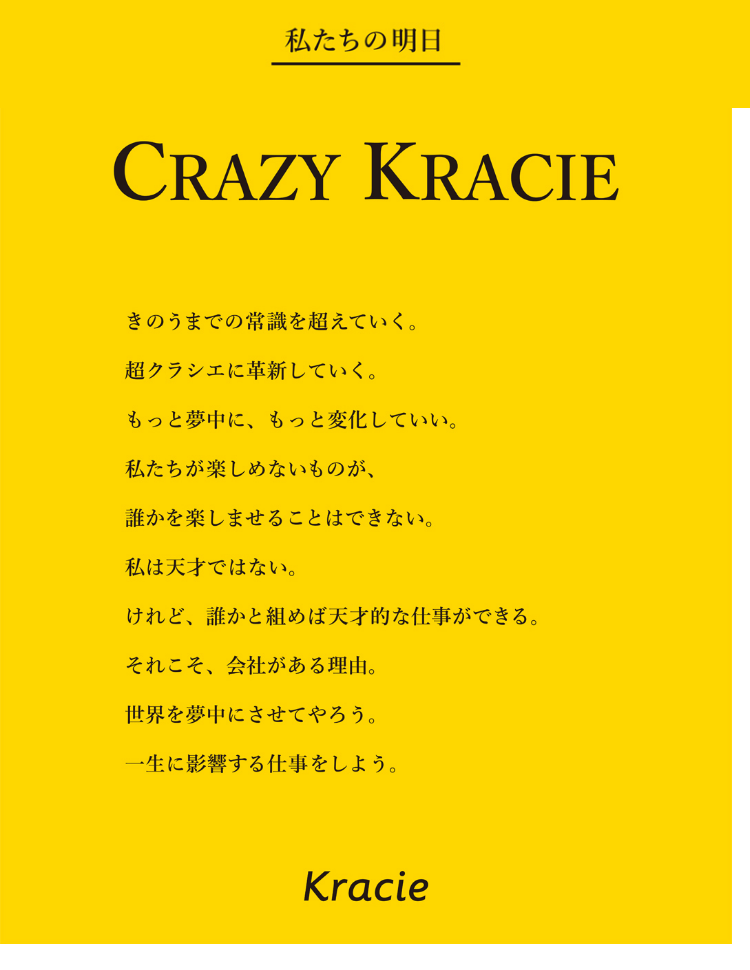「CRAZY KRACIE」は、夢中になれる明日を生活者に届けるために、挑戦することが企業風土として定着することを目指して掲げられたクラシエのビジョンです。