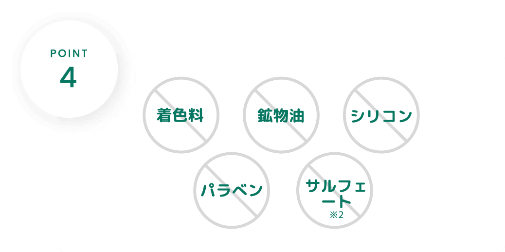 着色料・香料・鉱物油・シリコン・パラベン・アルコール(エタノール)・サルフェート(硫酸系界面活性剤)不使用。