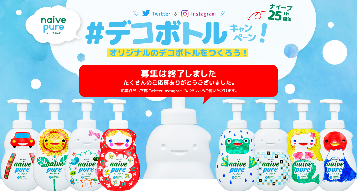 概要:油性ペンやシール等でオリジナルのデコレーションをしたナイーブピュアのボトルを撮影し、投稿文に「#ナイーブピュア」「#デコボトル」「@naive_kracie」の3つをつけてTwitterまたはInstagramにて投稿していただいた方の中から、抽選で賞品をプレゼントいたします。