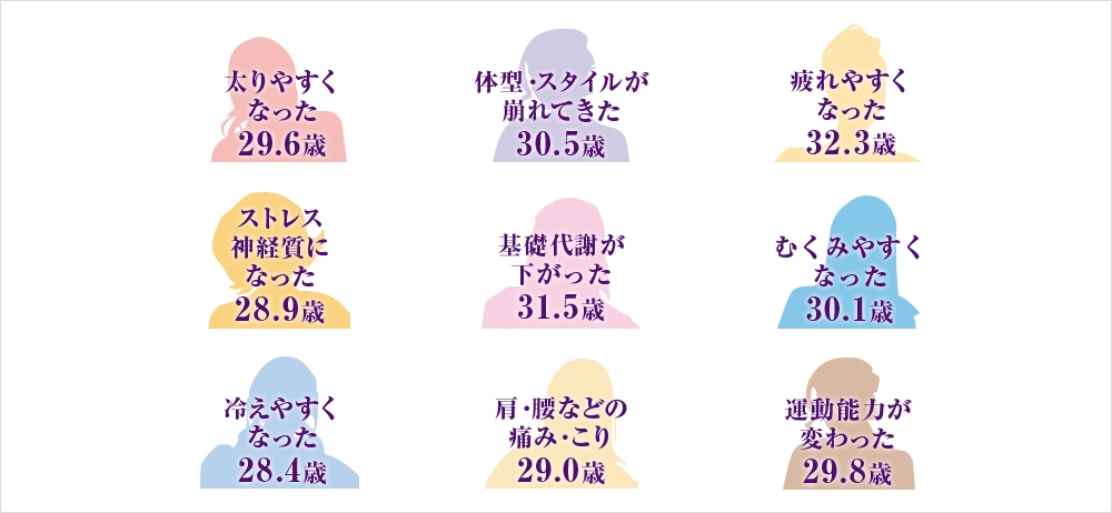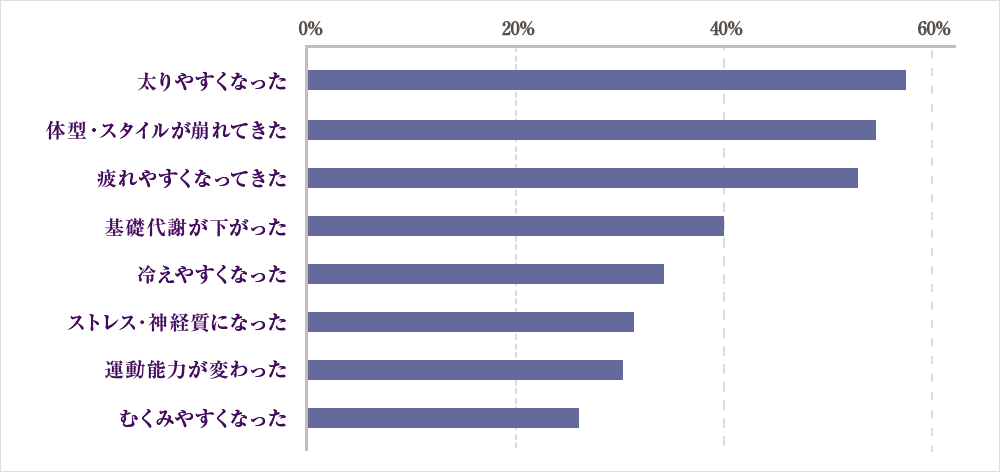 30代から50代女性にお聞きしたデータによると、「自分のからだで変化を感じることは…?」の問いに対して、次の項目があがりました。