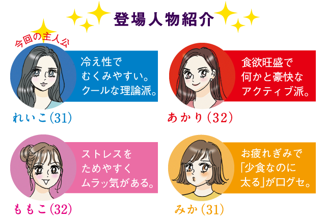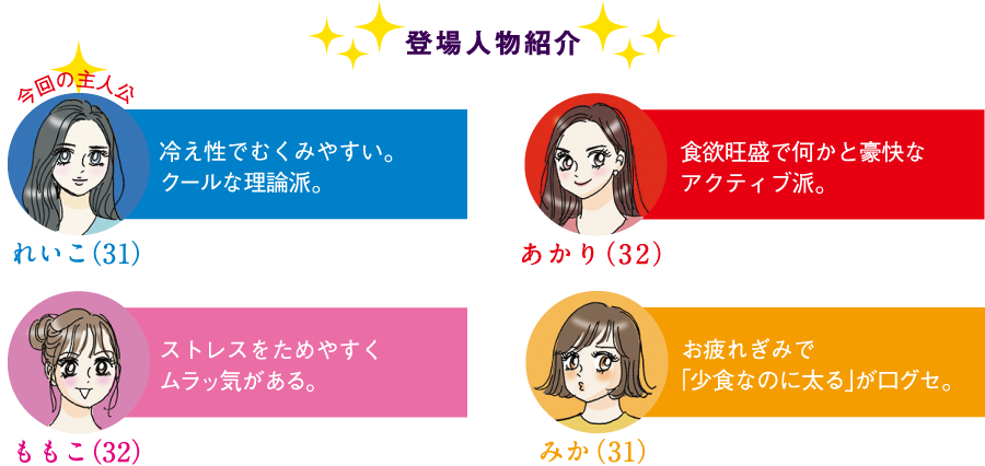 今回の主人公 れいこ(31) 冷え性でむくみやすい。クールな理論派。