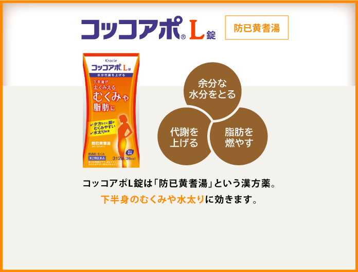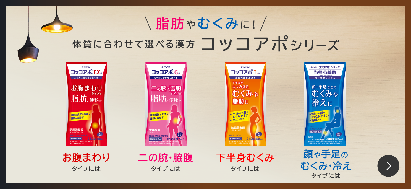 クラシエのコッコアポシリーズは、女性が悩む脂肪やむくみに太り方や体質から考えて、4処方の漢方薬をラインナップしています。自分の症状や悩みにあわせて選べることができ、脂質代謝や水分代謝アップをサポートしてくれます。