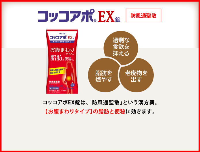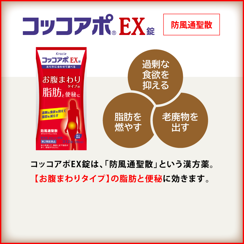 「防風通聖散(ぼうふうつうしょうさん)」のタイプ:食べ過ぎや間食が多く、代謝が追い付かなくなることでお腹まわりに脂肪がつきやすくなるタイプ。このタイプは胃腸の働きが乱れて便秘にもなりがちです。