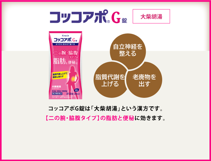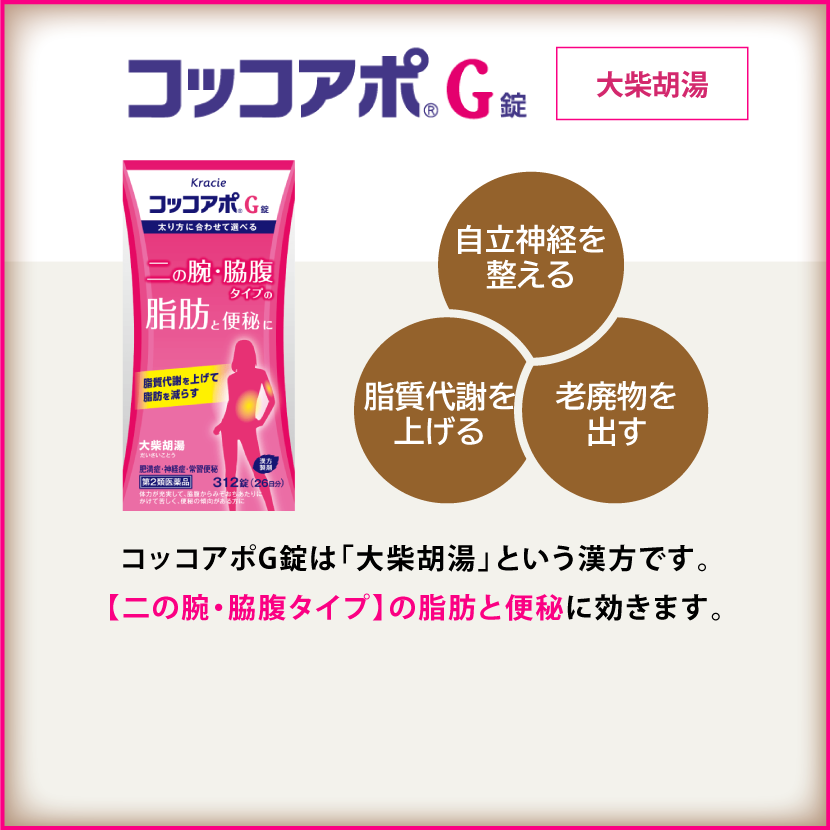 「大柴胡湯(だいさいことう)」のタイプ:年を重ねることやストレスなどでホルモンバランスが乱れ、脂質代謝が低下し、上半身を中心に、筋肉の少ない二の腕・脇腹に溜まりやすいタイプ。また、このタイプは食生活が乱れやすく、便秘にもなりがちです。