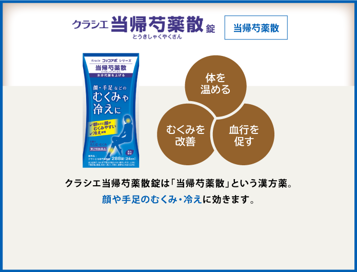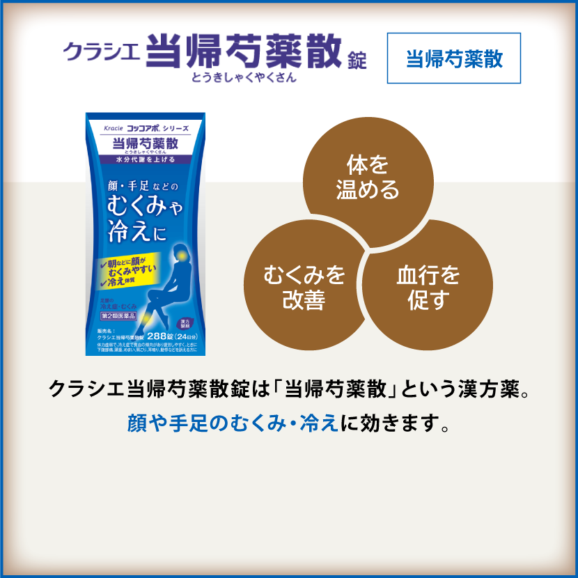 「当帰芍薬散(とうきしゃくやくさん)」のタイプ:寒いのが苦手で、あまり汗をかかない、顔・手足の冷えとむくみがあるのが特徴のタイプです。冷えがあると水分代謝が悪くなり、体内に水分をため込んでしまいます。さらには、血管外の余分な水分は血管を圧迫し、血行を悪くしてしまうため、より冷えやすくなり、むくみと冷えの悪循環に陥ってしまうのです。その時に、特に体の末端である顔や手足にむくみがでやすくなります。