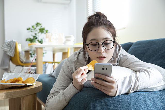 夜遅くまで、テレビや動画・SNSを見て、睡眠時間が削られるのはもちろん、スマホやPCのブルーライトで睡眠が浅くなります。十分な睡眠が取れていないと、日中のムダ食いが増えるので在宅太りに。