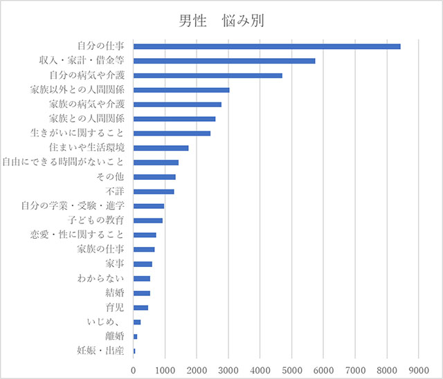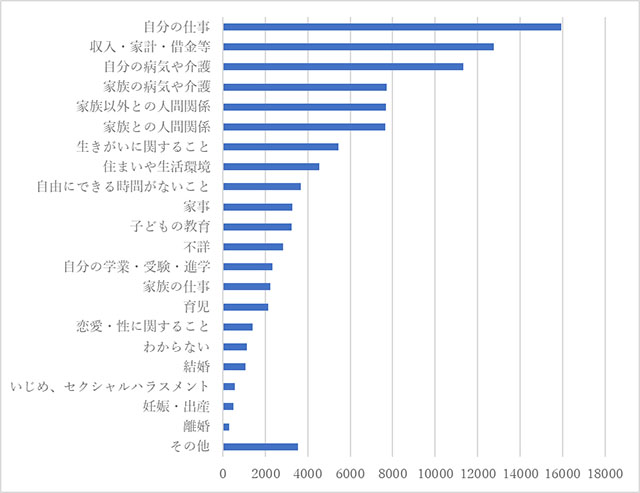 項目別で見てみると、男女ともにトップ3は変わらず、1位「自分の仕事」、2位「収入・家計・借金等」、3位「自分の病気や介護」。ただし、4位になると男性は「家族以外との人間関係」になるのに対し、女性は「家族との人間関係」となります。女性の社会進出が進んだ今も、定年まで働くのは男性が多く、家庭の主なことは女性がおこなっていることが多く、その背景がデータに表れていると考えられます。