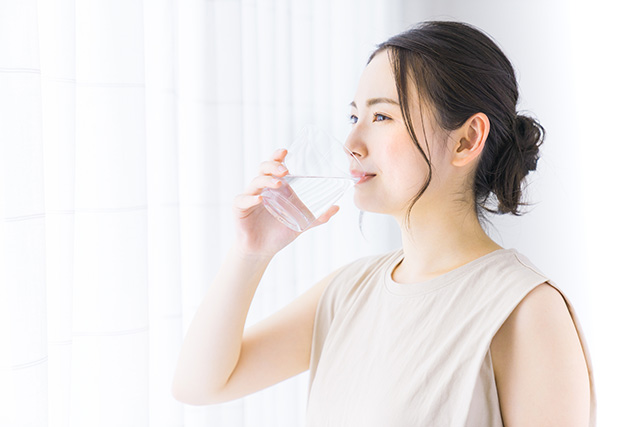 1日1〜2リットルを目安に水分を摂りましょう。寒い時は、白湯にするほか、外出時にもミネラルウォーターのボトルを持参するなどして、1日の中でこまめに補給するのがコツ。食事でもスープや味噌汁など、水分を摂るように意識をしましょう。
